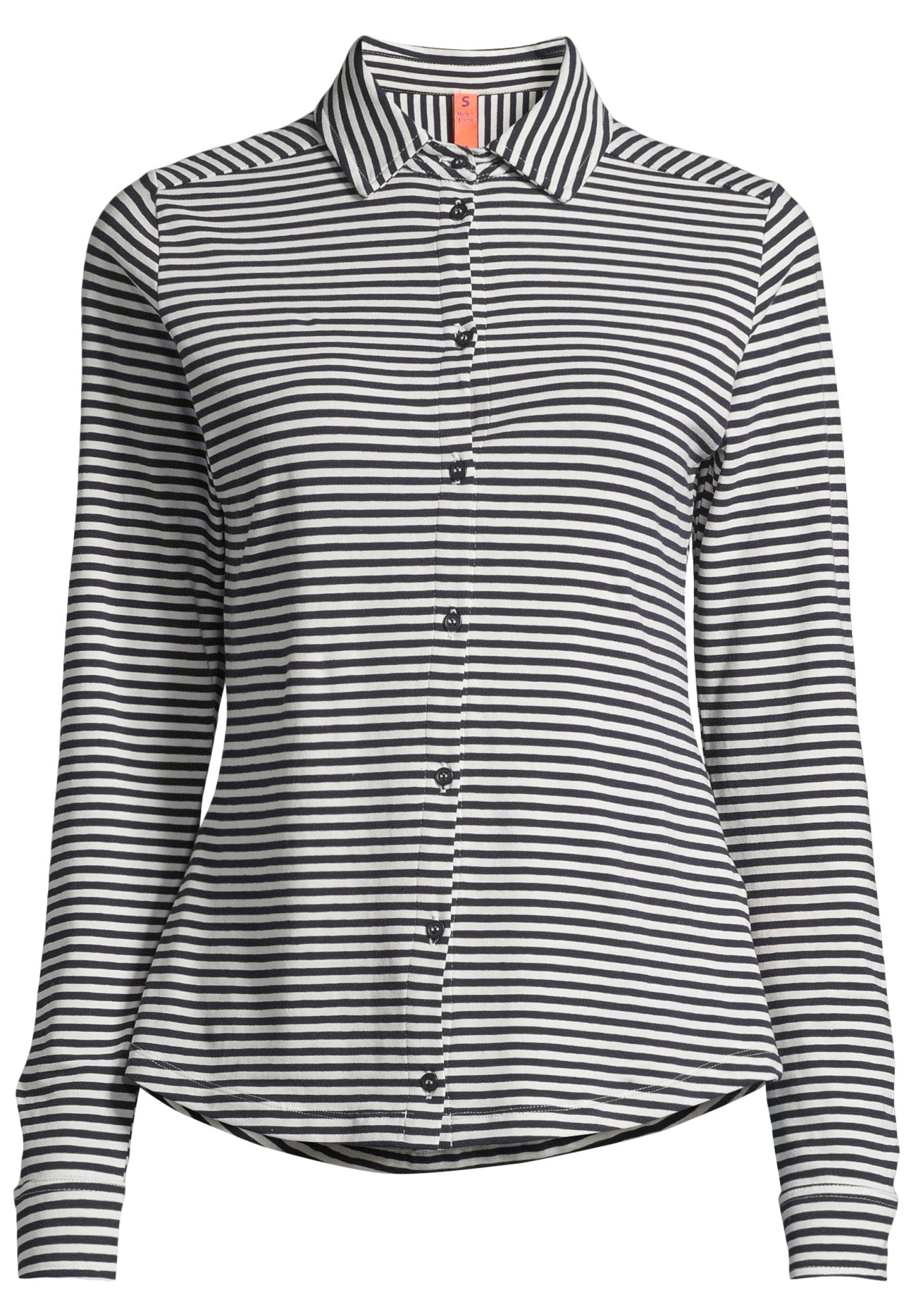 Die OLMÖK Damen Tailliert Bluse von Salzhaut fühlt sich angenehm leicht und anschmiegsam an: der taillierte Schnitt schmeichelt der Silhouette, während der Jersey-Stoff mit maritimem Streifenmuster luftig über die Haut liegt und Bewegungsfreiheit schenkt. Die langärmelige Bluse sitzt so, dass sie sowohl im Alltag als auch bei kleinen Abenteuern zuverlässig Komfort bietet, immer mit nordischer Lebensfreude im Gepäck.