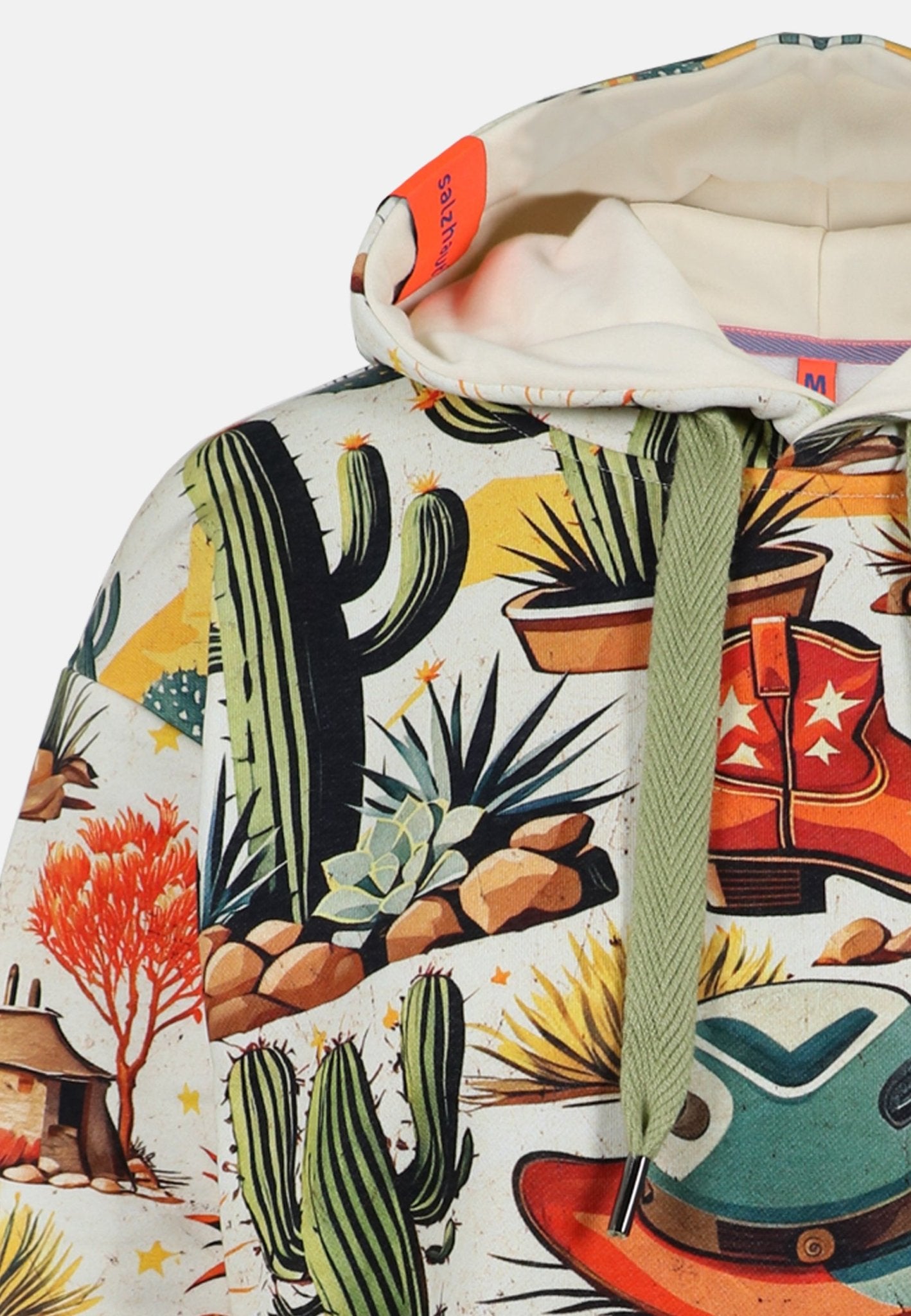 Die Qualität des Hoodies zeigt sich in der robusten Baumwollmischung und dem formstabilen, weichen Griff, sorgfältig verarbeitet von Salzhaut. Der lebendige All-over Print im Wildwest-Thema setzt fröhliche, farbenfrohe Akzente, während die faire Fertigung für beständige Freude sorgt. Feine Details geben dem Teil zusätzlichen Charakter. So bleibt der Look saisonübergreifend frisch und präsent.