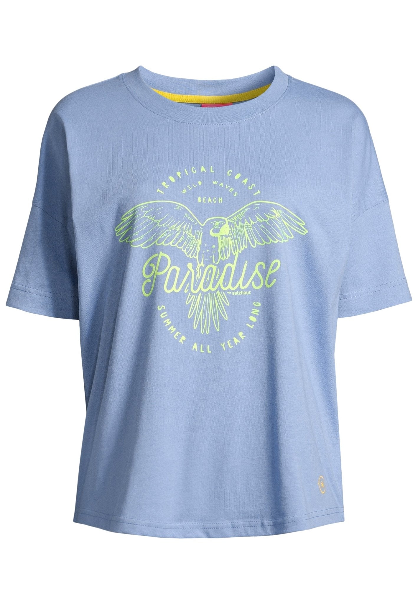 Gefertigt aus weicher Baumwolle mit leichtem Stretch, bietet dieses Shirt ein angenehmes Hautgefühl und eine vertraute Haptik. Der auffällige Frontprint Paradies setzt einen farbenfrohen Akzent, während die Verarbeitung mit Liebe von Salzhaut gemacht auf faire Produktionsbedingungen in Europa verweist. Die sorgfältige Fertigung macht das Shirt alltagstauglich und langlebig, ohne auf die verspielte Optik des Prints zu verzichten.