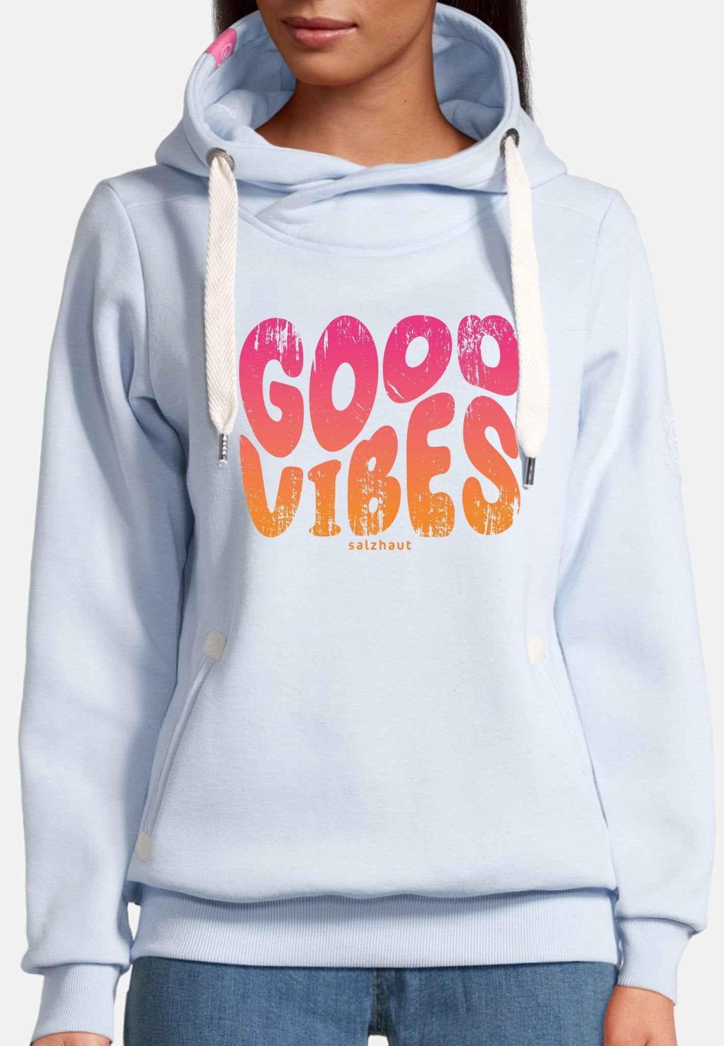 The SÜNN - GOOD VIBES Women's Fitted Hoodie from Salzhaut flatters the silhouette while feeling pleasantly cozy. The fitted cut creates feminine lines, while the hood and side pockets offer freedom of movement and everyday practicality. This women's hoodie combines Nordic lightness with a soft, snug touch that spreads good vibes in any situation.