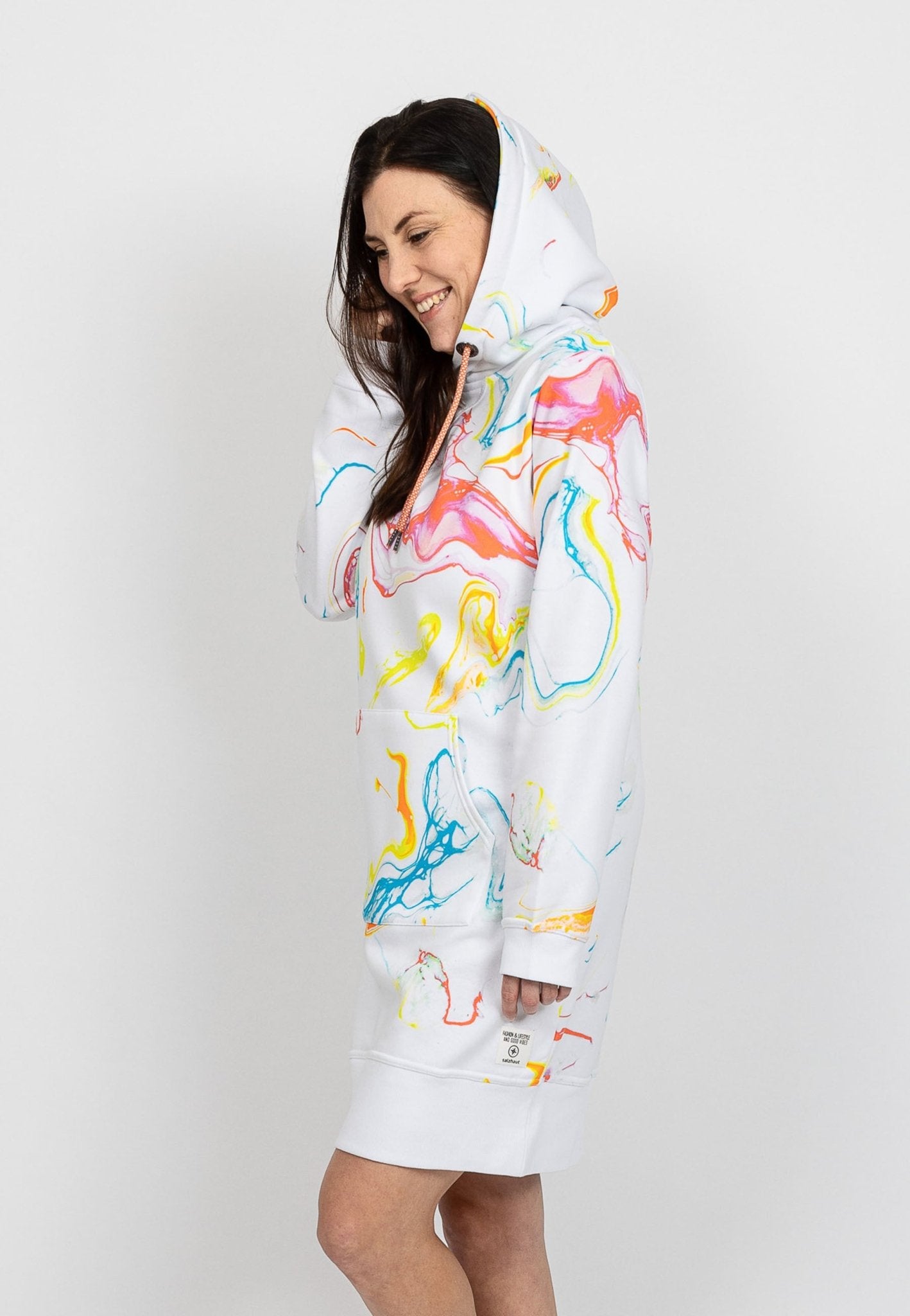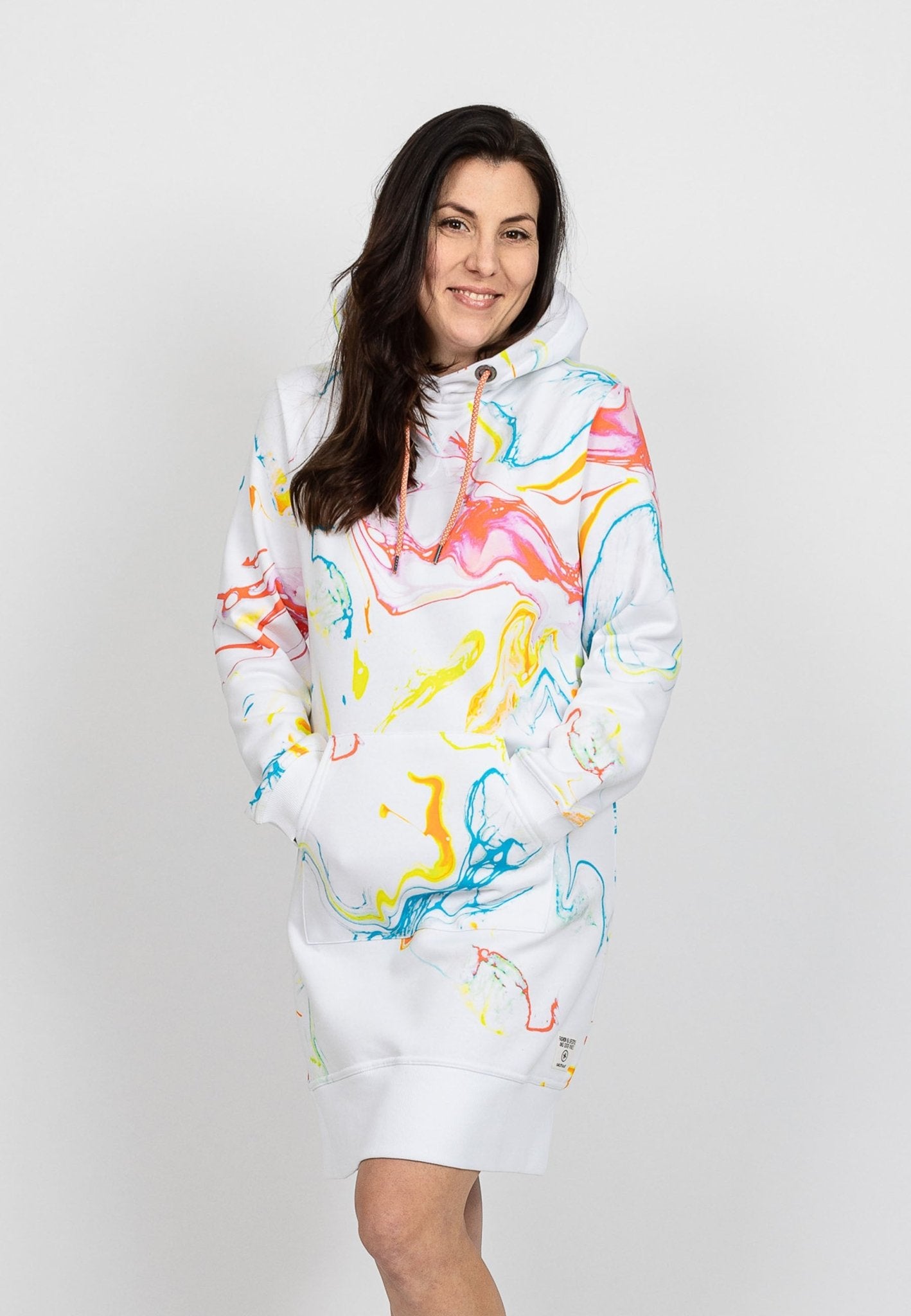 The KRŪD Women's Oversized Hoodie Dress from Salzhaut immediately offers a light, flattering wearing experience: the oversized fit sits airy on the body, the hood gently frames the neck, and freedom of movement remains unrestricted. This hoodie dress combines Nordic lightness with a relaxed silhouette, perfect both for a stroll through Hamburg and cozy days at home, conveying pure, colorful joy of life when worn.