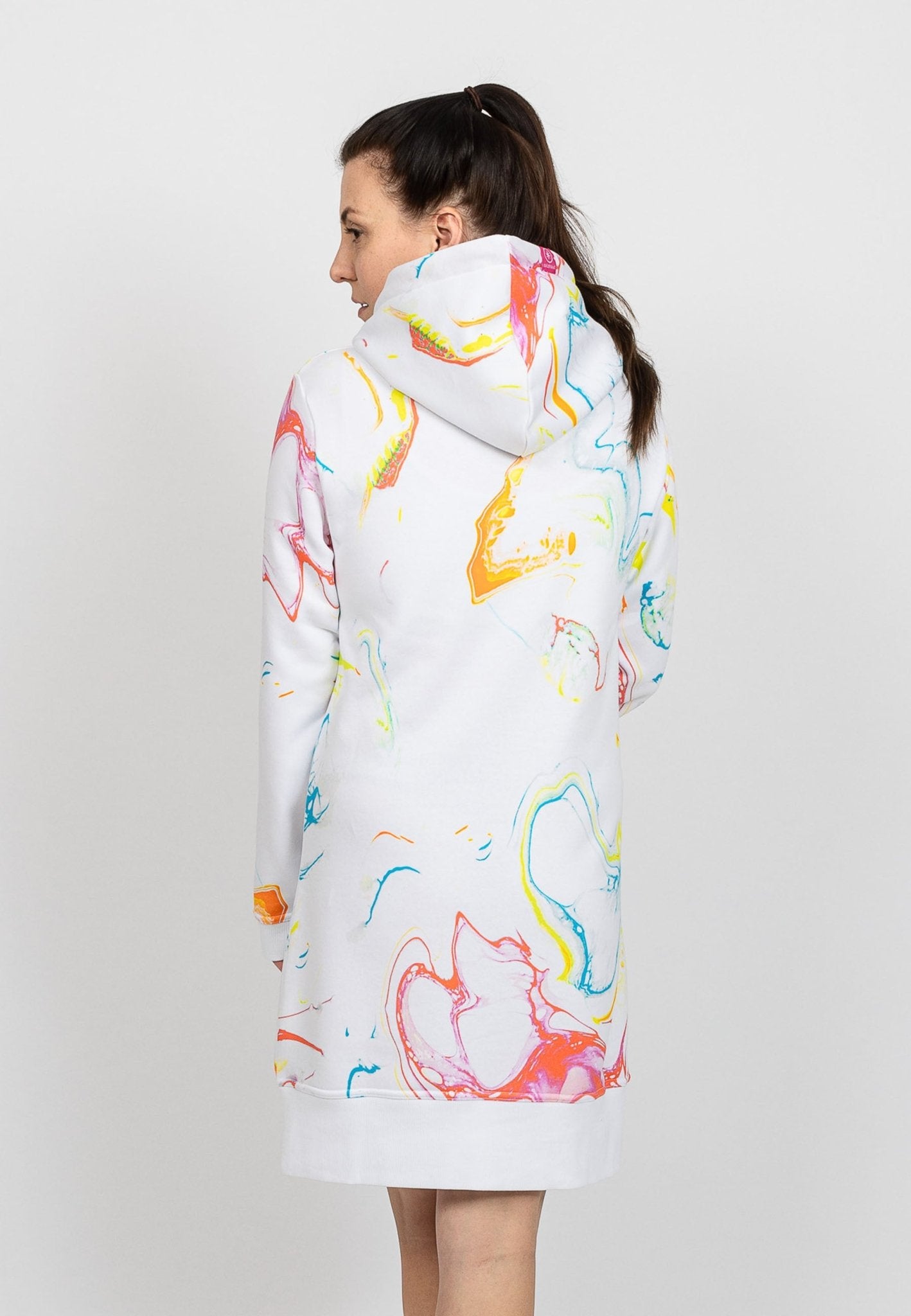 Made from a soft, brushed cotton blend, the KRŪD hoodie dress feels pleasantly warm yet breathable without appearing stiff. The vibrant, colorful marble print makes a cheerful statement and remains vivid for a long time thanks to careful craftsmanship, while the loving manufacturing and fair production in Europe underline the Salzhaut promise. Thus, striking design meets thoughtful quality.