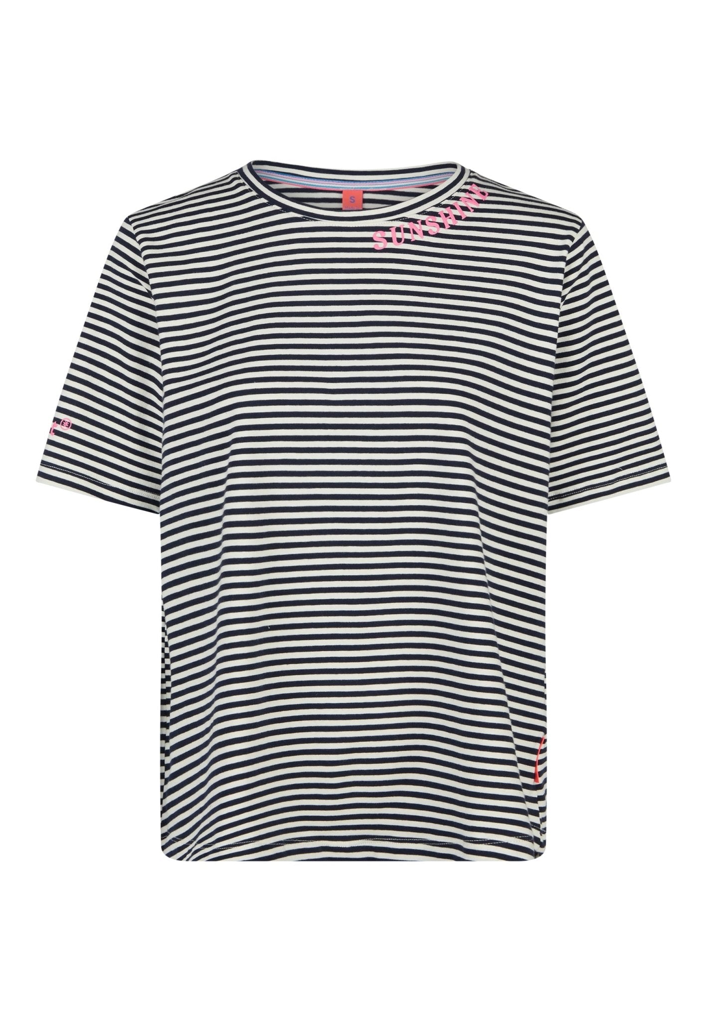 The T-shirt is available in a stylish navy-offwhite stripe pattern and is perfectly complemented by the foam print “SUNSHINE” in blossom at the neckline.
