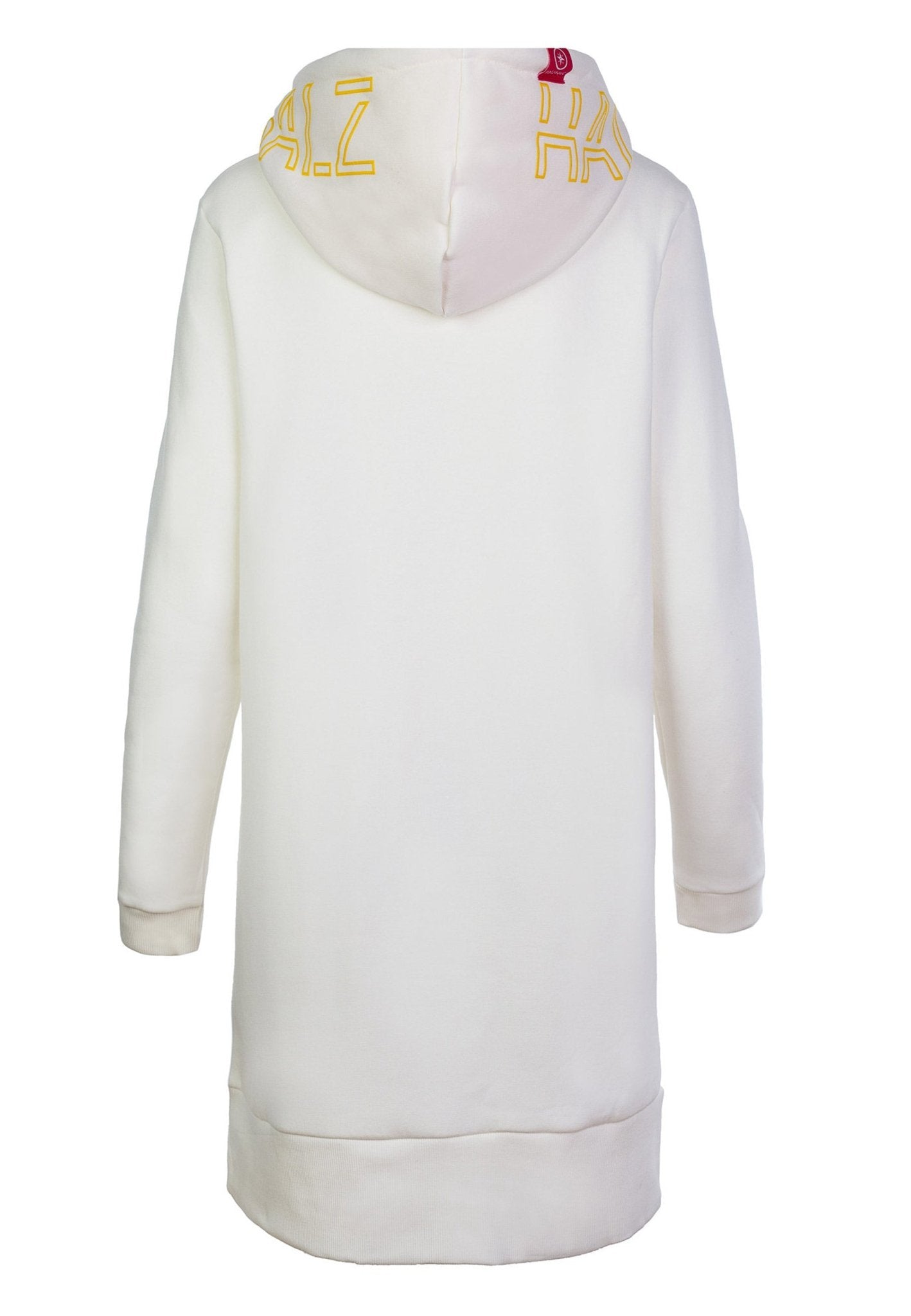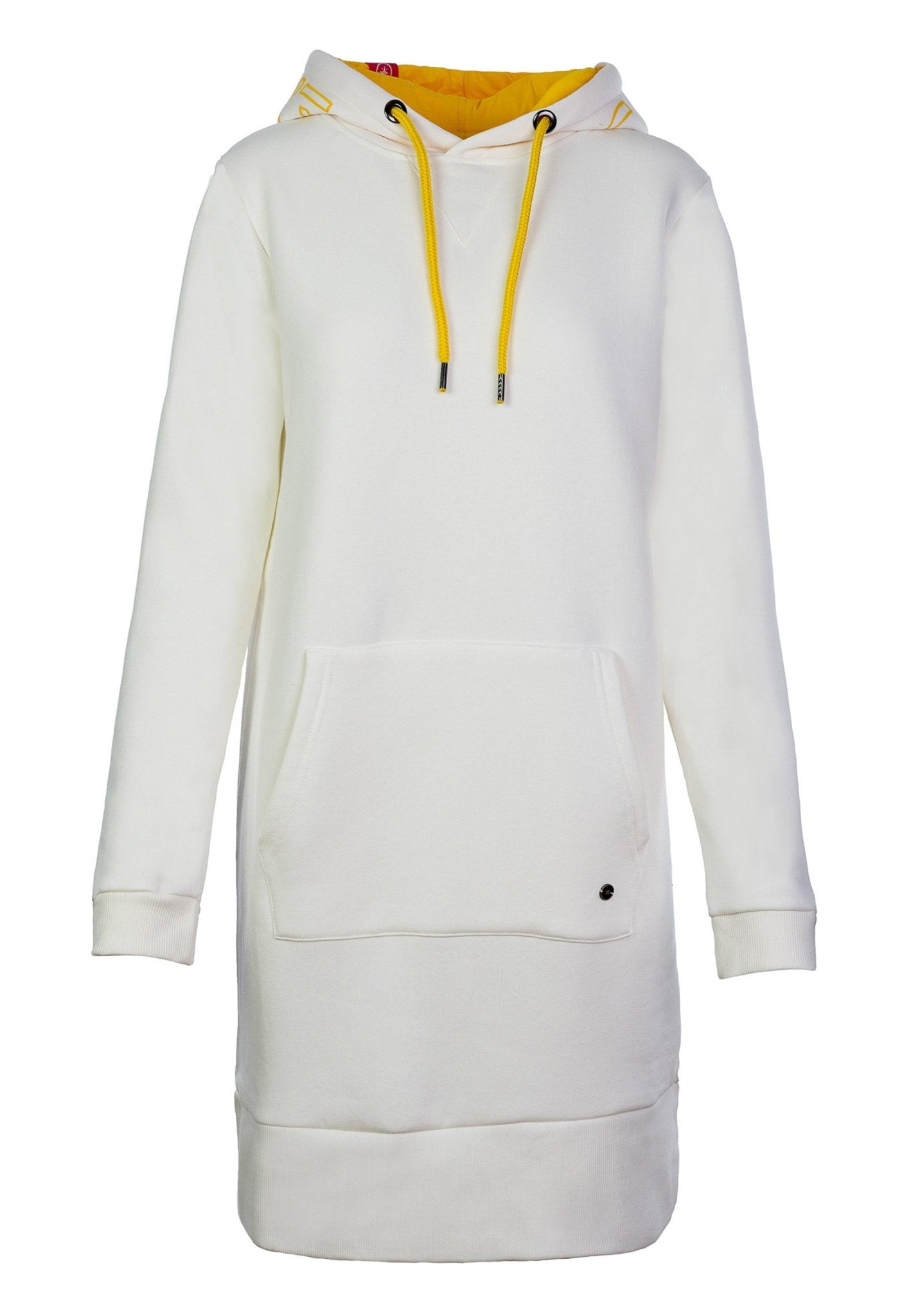 The FABIENNE women's regular fit is an off-white hoodie dress with yellow highlights that feels instantly cozy when worn. The dress flatters the body in its regular fit, offers comfortable freedom of movement, and combines Nordic lightness with snug wearing comfort. The large cozy hood provides extra protection on cool days and makes the hoodie dress a cherished companion for relaxed hours and small adventures. Salzhaut thus brings cheerful accents to everyday life.
