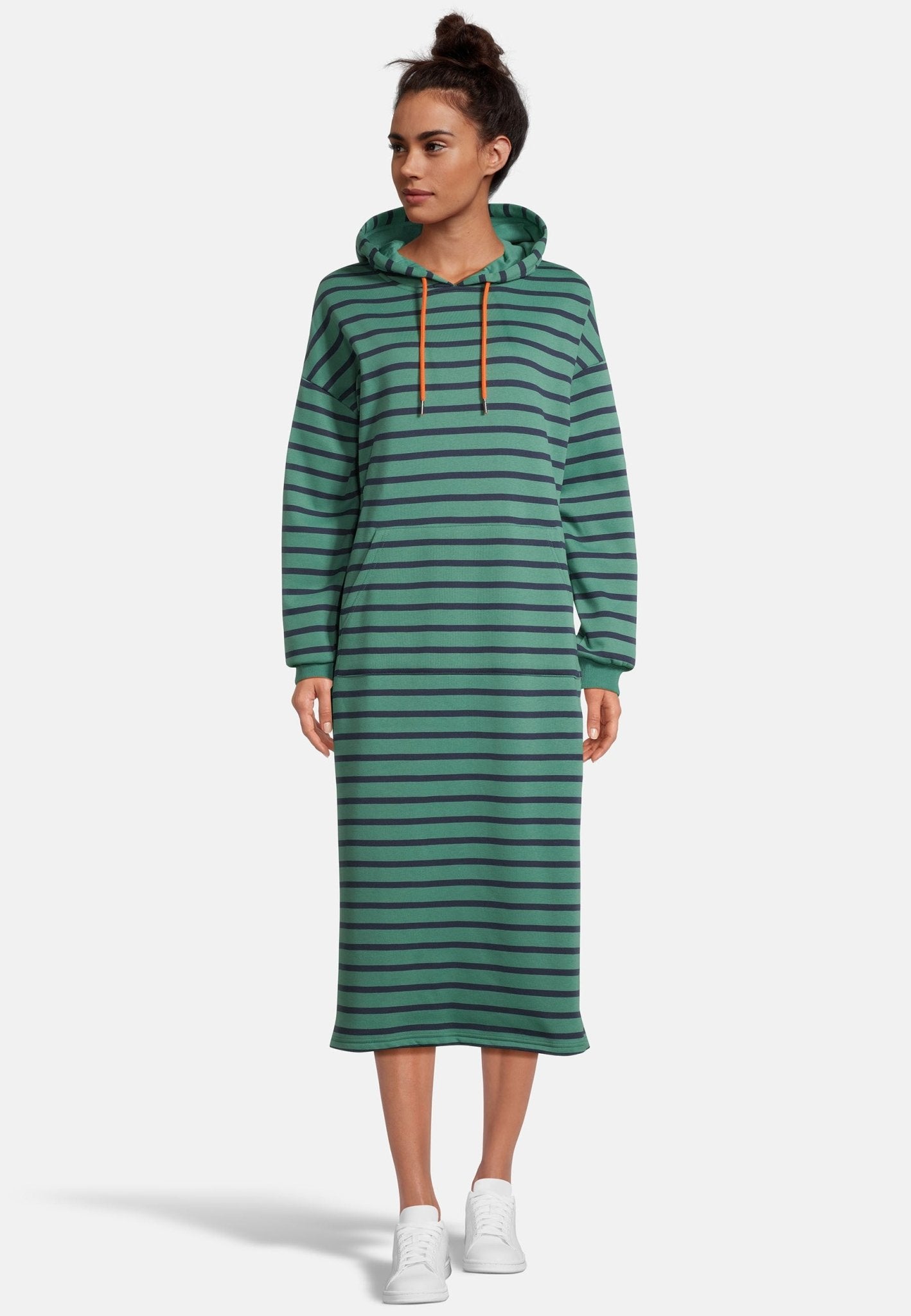For the IRLIN women's tailored dress, Salzhaut chose a brushed cotton blend that keeps warm and feels soft; the patch belly pocket and finely crafted sleeve cuffs add subtle accents. Made with love and manufactured in Europe, this hoodie dress stands for careful workmanship and sustainable design. The striped look and the tailored fit give the hoodie dress a feminine yet casual character. This shows Salzhaut how durable quality and colorful details harmonize.