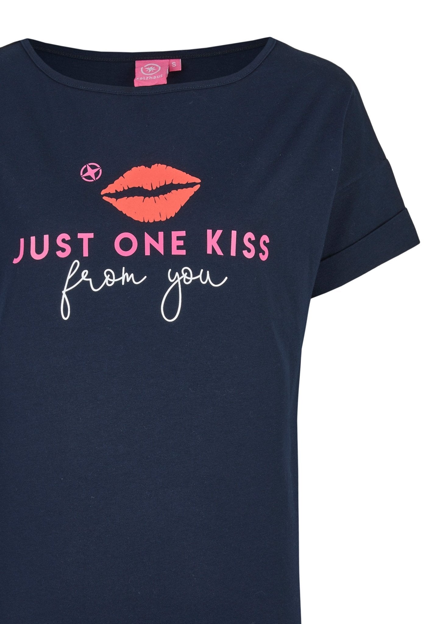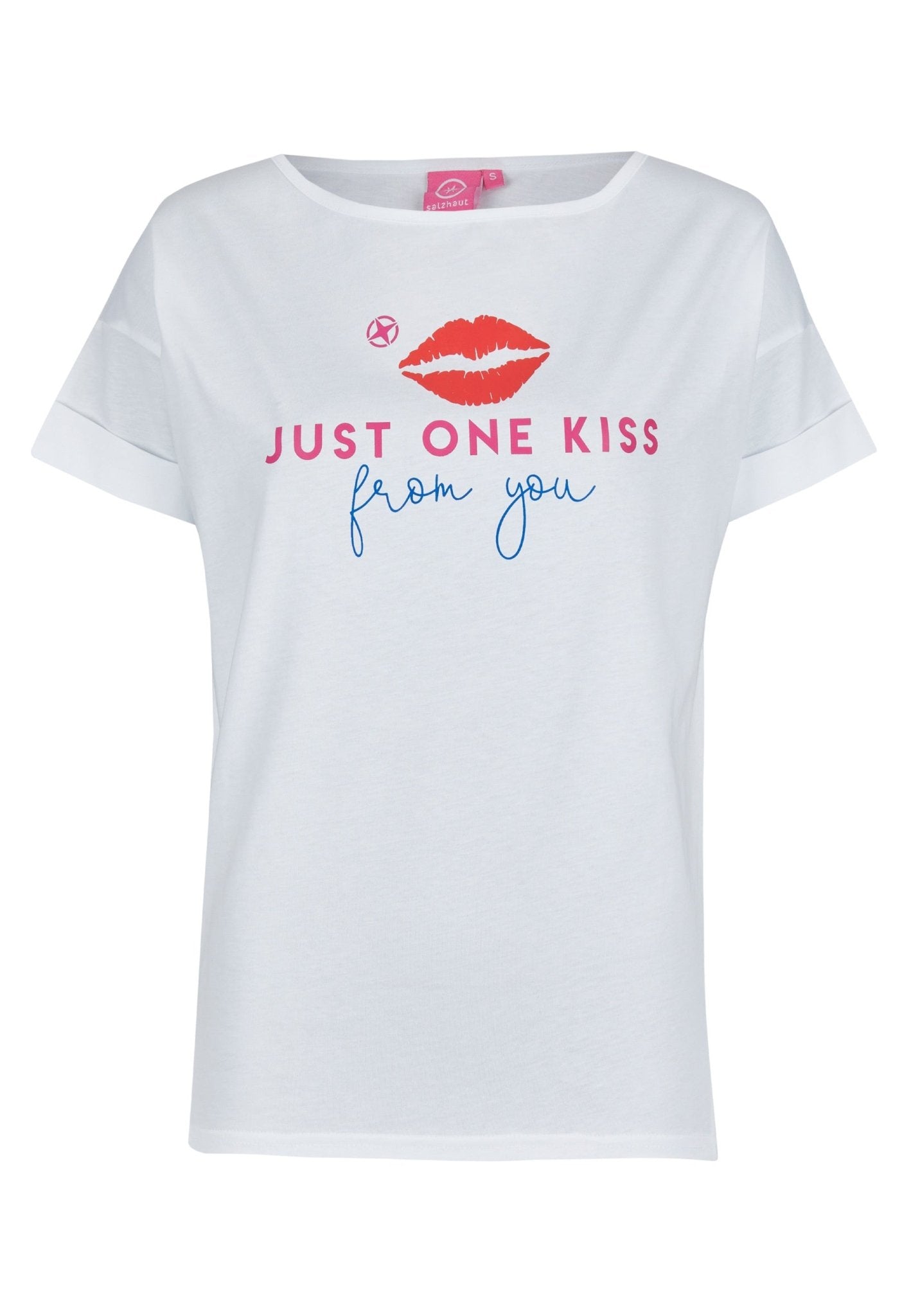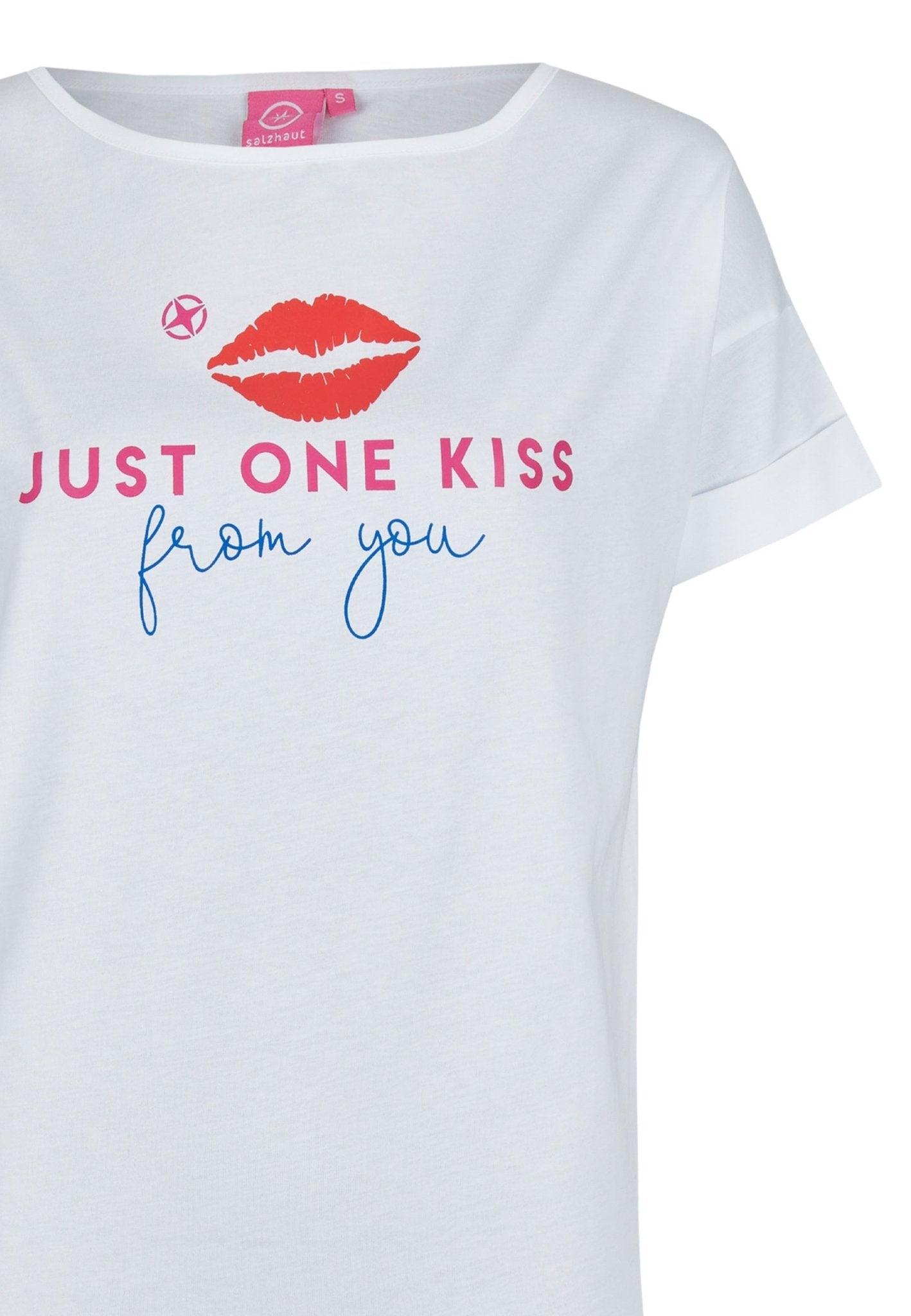 Die Qualität des DANIELLA Damen normale Passform zeigt sich in weicher Baumwolle und einem klaren Frontprint – dem coole Just One Kiss Mottoprint, der dem Shirt Charakter verleiht. Sorgfältig gefertigt wirkt das Shirt ruhig und beständig, die Verarbeitung ist auf Langlebigkeit bedacht und das Design bleibt auch nach häufigem Tragen präsent. Erhältlich in Navy oder Weiss, verbindet dieses Shirt die Salzhaut-Philosophie von farbenfroher Lebensfreude mit unaufdringlicher Eleganz.
