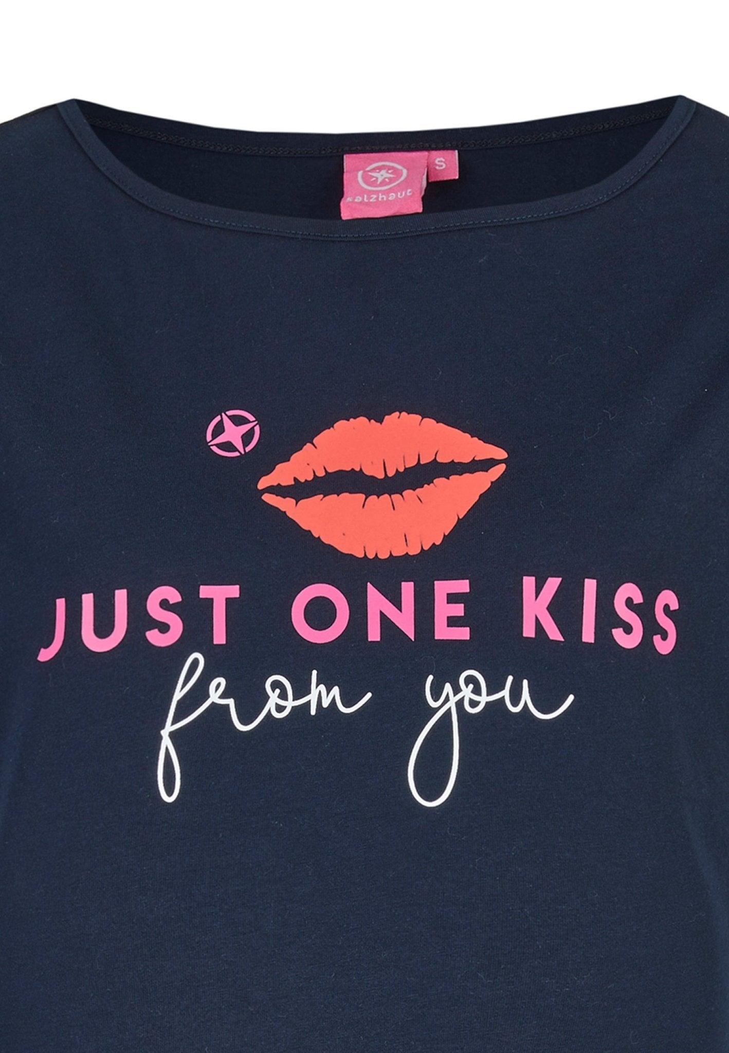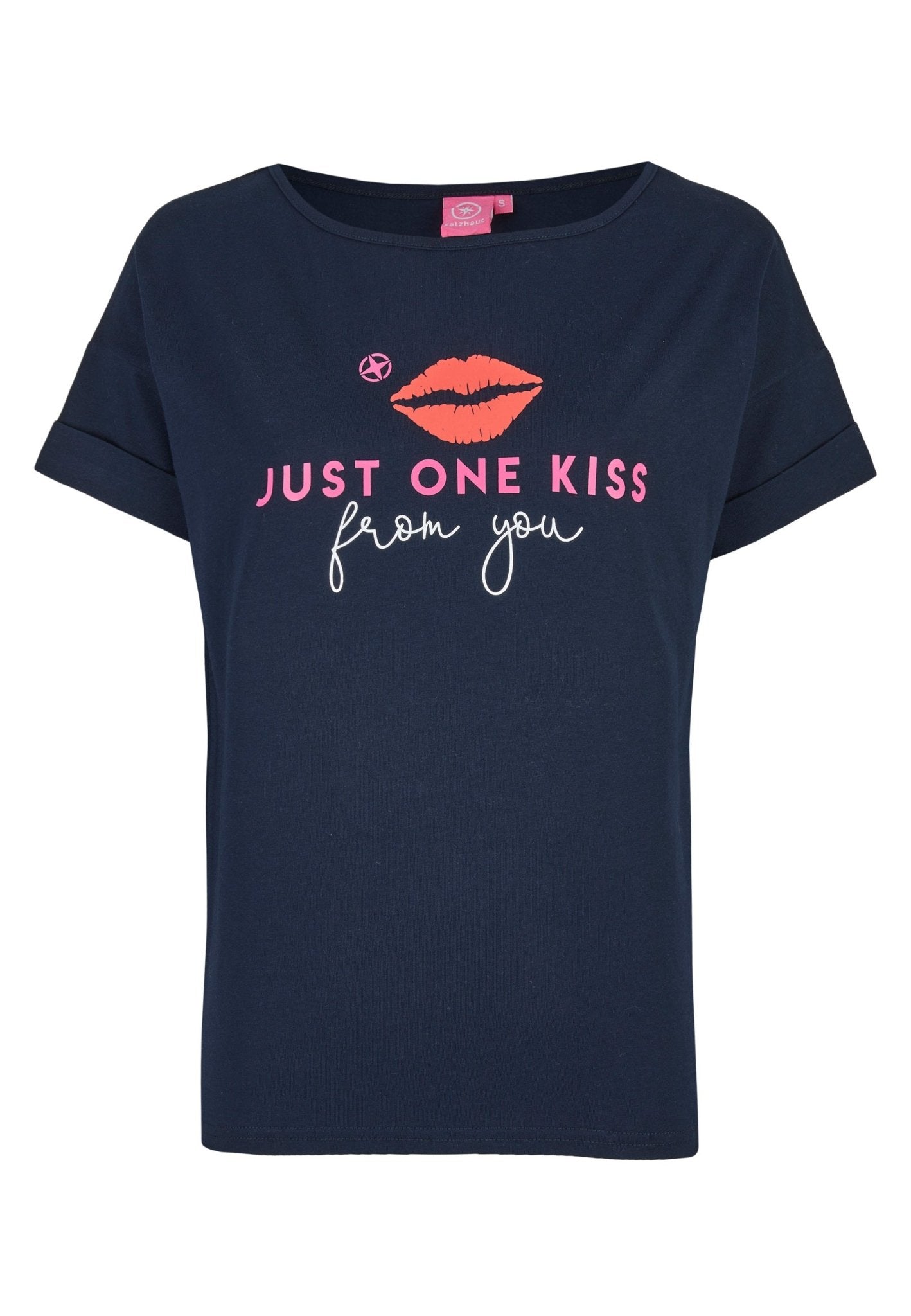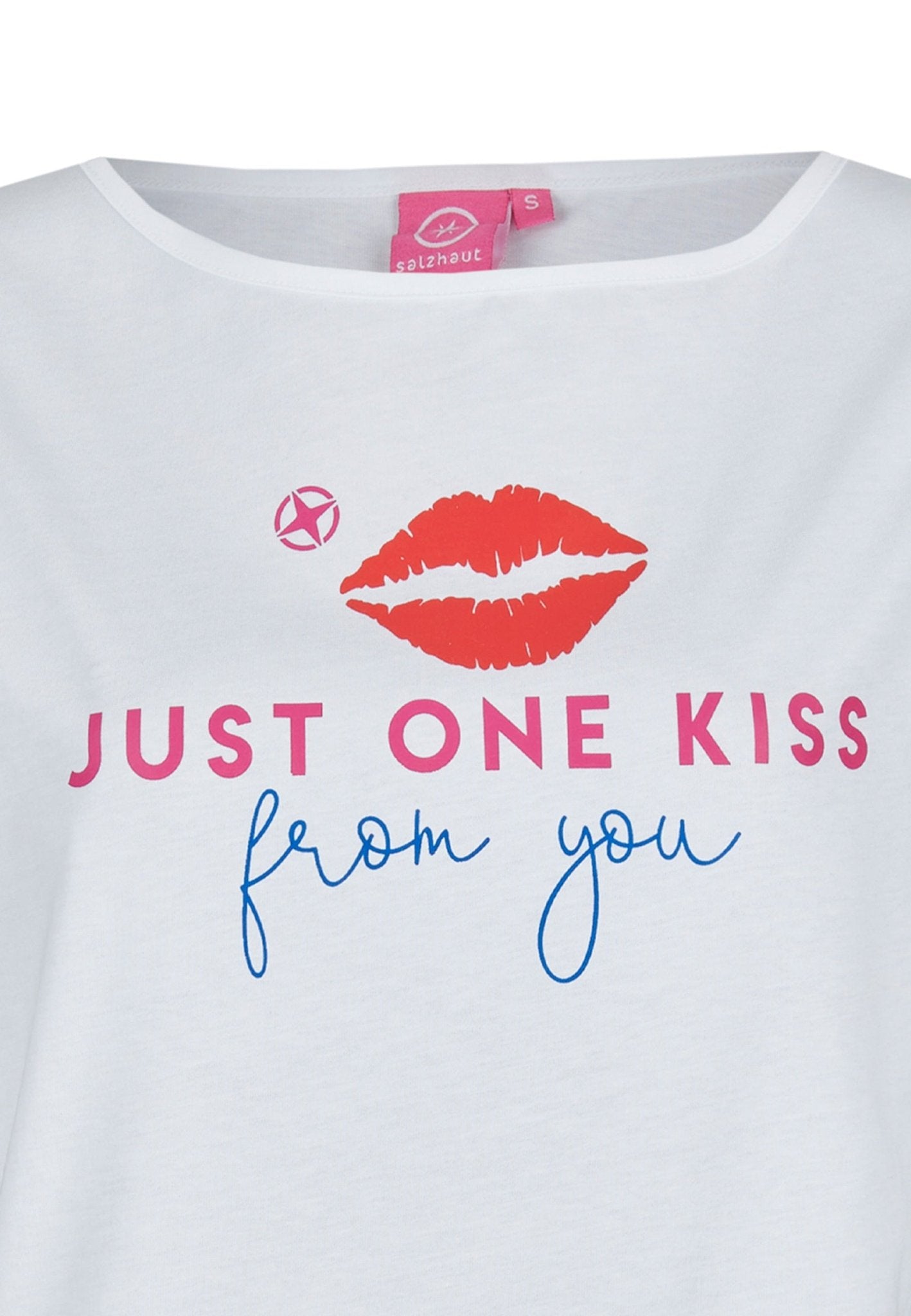 Die Qualität des DANIELLA Damen normale Passform zeigt sich in weicher Baumwolle und einem klaren Frontprint – dem coole Just One Kiss Mottoprint, der dem Shirt Charakter verleiht. Sorgfältig gefertigt wirkt das Shirt ruhig und beständig, die Verarbeitung ist auf Langlebigkeit bedacht und das Design bleibt auch nach häufigem Tragen präsent. Erhältlich in Navy oder Weiss, verbindet dieses Shirt die Salzhaut-Philosophie von farbenfroher Lebensfreude mit unaufdringlicher Eleganz.